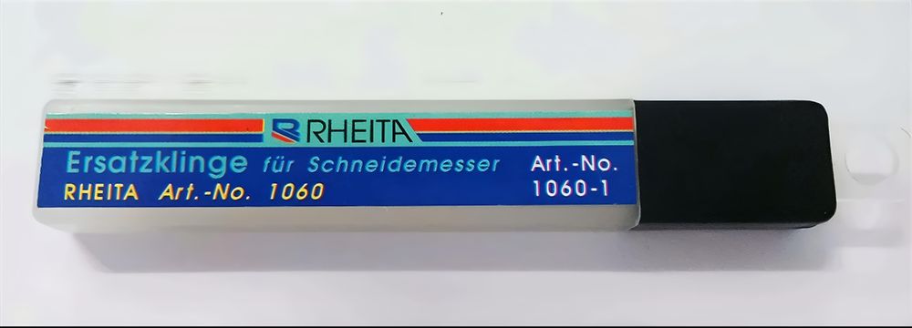 12 Ersatzklingen für Schneidmesser in Plastikbox mit Verschlußkappe und Anhänger
