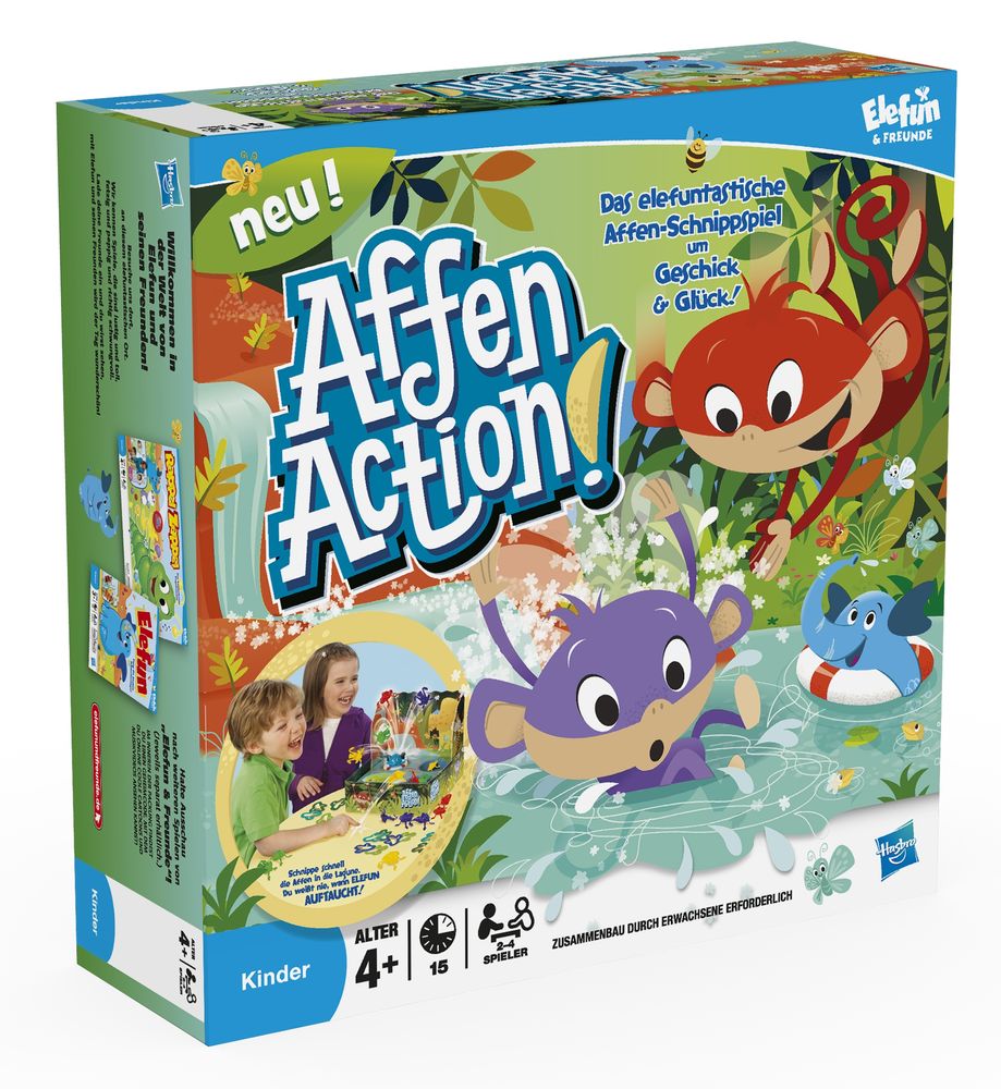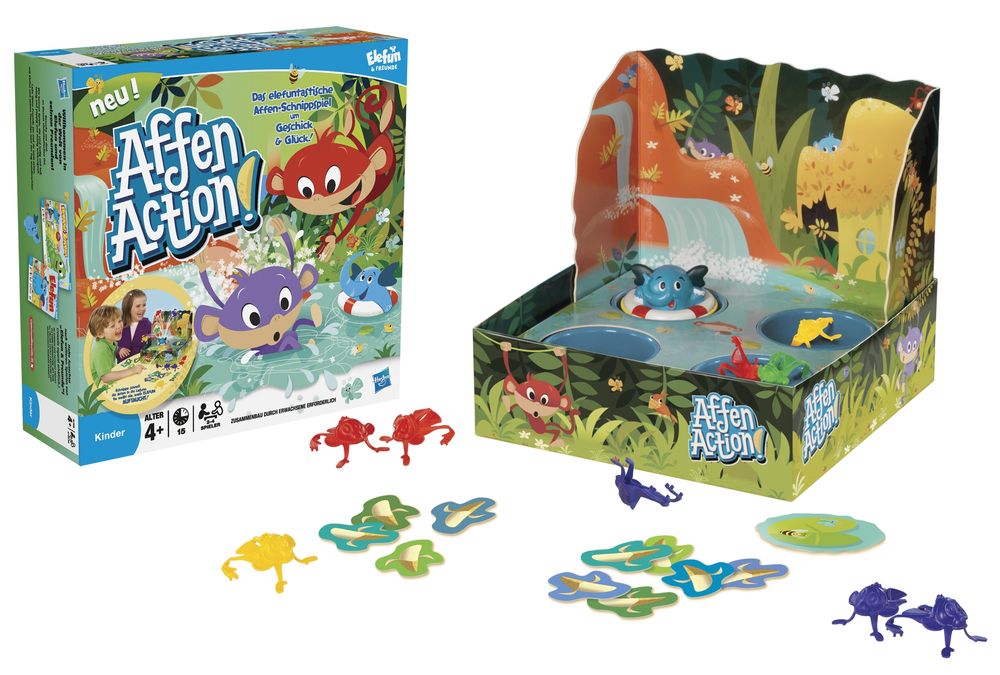 Altersgerechtes Affenspektakel mit Elefun: Solange Elefun unter Wasser ist, können die kleinen Spieler ihre Affen in die Lagune schnipsen. Aber Vorsicht - taucht Elefun auf, ist das Spiel vorbei! Wer bis dahin die meisten Äffchen versenkt hat, gewinnt das Spiel.