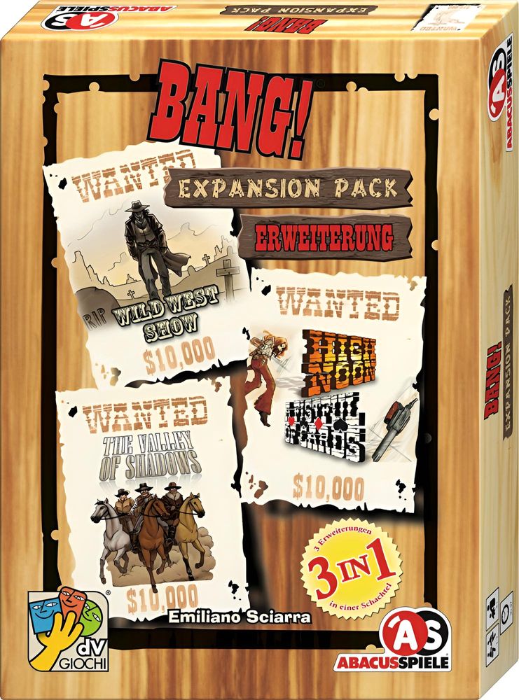 BANG! ist die erfolgreichste Western-Kartenspiel-Serie mit weltweit über 1.000.000 verkauften Spielen. Für alle die noch mehr spannende Duelle und rauchende Colts wollen, bringt der BANG! Expansion Pack 3 Erweiterungen für erfahrene Revolverhelden ins Spiel. BANG! The Valley of Shadows: Nur die wagemutigsten Revolverhelden trauen sich in das "Tal der Schatten". Dort lauern nicht nur Klapperschlangen, Kopfgeldjäger und Tornados auf dich - auch die Geister deiner Gegner können dich heimsuchen. BANG! Wild West Show: Vorhang auf zur verrücktesten Show im Wilden Westen. Neue, mächtige Revolverhelden sind in der Stadt und bringen jede Menge Chaos mit sich. Unfaire Duelle und unvorhersehbare Ereignisse sorgen für ein turbulentes Spielvergnügen. BANG! High Noon und A Fistful of Cards: In der Hitze der Mittagssonne gehen die Duelle zwischen Sheriff und Banditen in die nächste Runde. Spannende Ereigniskarten sorgen für noch mehr Abwechslung für das Western-Kultspiel.