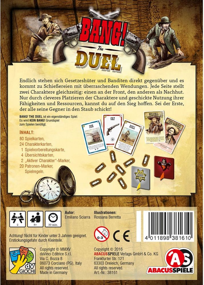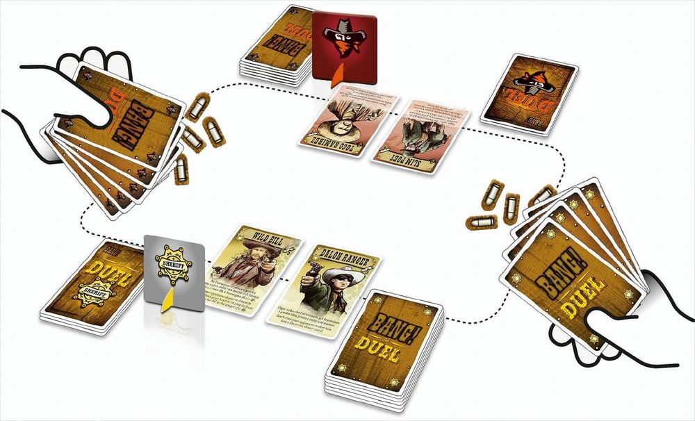 BANG! The Duel: Endlich stehen sich Gesetzeshüter und Banditen direkt gegenüber und es kommt zu Schießereien mit überraschenden Wendungen. Jede Seite stellt zwei Charaktere gleichzeitig: einen an der Front, den anderen als Nachhut. Nur durch cleveres Platzieren der Charaktere und geschickte Nutzung ihrer Fähigkeiten und Ressourcen, kannst du auf den Sieg hoffen. Sei der Erste, der alle seine Gegner in den Staub schickt!