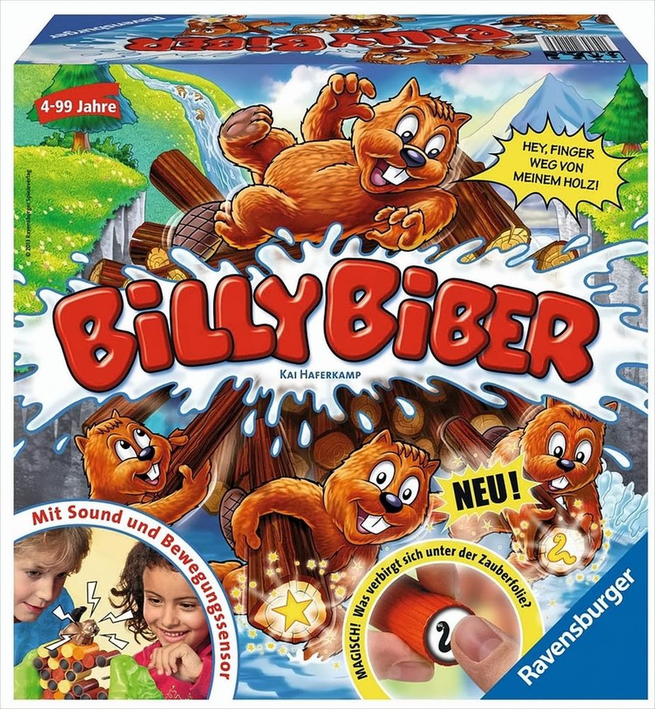 Hey, Finger weg von meinem Holz! Billy Biber hat sich so viel Mühe gegeben und alle Stämme aufgestapelt, aber die Biberkinder (Spieler) versuchen geschickt, Billys Stämme zu stibitzen. Einen nach dem anderen schieben sie aus dem Holzstapel heraus - ganz vorsichtig, damit nichts wackelt oder gar umfällt! Sonst bemerkt Billy, der wachsam obendrauf liegt, den dreisten Klau und meckert laut, was das Zeug hält. Dann müssen die Biberkinder den gerade geklauten Stamm wieder zurücklegen. Hier ist Konzentration und Geschicklichkeit gefragt. Und aufgepasst! In einigen Stämmen haben sich Holzwürmer versteckt. So ein Pech! Denn nur die Stämme zählen, die als Symbol Jahresringe oder einen Stern tragen. Jetzt wird schnell nachgesehen, was die magische Zauberfolie auf dem Baumstamm zeigt. Einfach mit dem Finger darüberrubbeln … die Spannung steigt! Wer wird als Erster sechs der wertvollen Stämme erbeuten? Und zwar immer zwei braune, zwei orange und zwei gelbe Stämme, die als Symbol Jahresringe oder einen Stern zeigen. Aber psst! Billy Biber liegt stets auf der Lauer ...