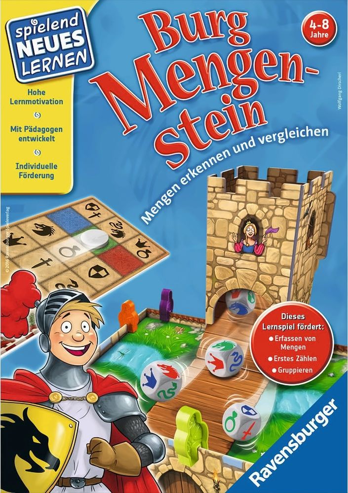 Jonas und seine Freunde lieben es, mit Schwert und Rüstung in die Welt der alten Ritter einzutauchen. Sie wollen möglichst schnell die andere Seite des Turms der Burg Mengenstein erreichen, die natürlich von einem schützenden Wassergraben umgeben ist. Sechs Motivwürfel helfen ihnen dabei.Es klackert und klappert auf Burg Mengenstein, denn die sechs Würfel fallen durch den Turm und landen auf der Zugbrücke. Sie zeigen Motive wie Schwert oder Schild und verschiedene Farben. Außerdem kann man sie nach Kategorien gruppieren. Jetzt heißt es erst mal, Ordnung in die Würfel zu bringen, denn im nächsten Schritt muss eine Scheibe auf einem Spielfeld mit Geschick auf die betreffenden Motive, Farben oder Kategorien geschnippt werden. Landet die Scheibe beispielsweise auf dem Schwert und die Würfel zeigen drei Schwerter, darf Jonas drei Felder vorrücken.Kognitives Denken iist bei Burg Mengenstein ebenso erforderlich wie motorisches Geschick und ein glückliches Händchen. Es wird reihum gewürfelt und geschnippt, bis der erste Spieler mit seiner Figur das Ziel an der anderen Turmseite erreicht. Burg Mengenstein ist ein witziges Lernspiel, das mithilfe von erfahrenen Pädagogen entwickelt wurde. Unterschiedliche Spielvarianten sorgen für Abwechslung im ritterlichen Mittelalter und für kontinuierliche Spannung beim Spielen.