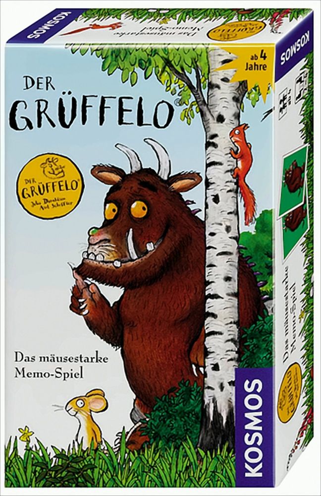 Wer kennt nicht den Grüffelo und die schlaue Maus? Hier sind mit ihnen alle Figuren des Kinderbuchklassikers auf den bunten Memo-Kärtchen versammelt - Fuchs, Eule, Schlange und auch die kleinen Tiere des Waldes wie Schmetterlinge, Käfer, Libelle, Frosch und Raupe. Wer deckt die meisten passenden Kartenpaare auf?