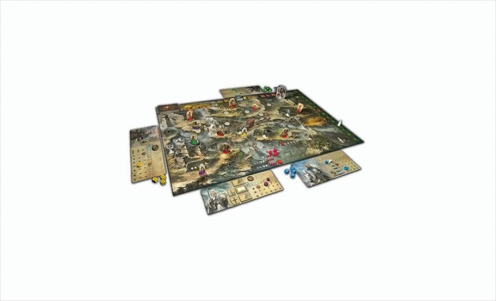 Inhalt: 1 großer, doppelseitiger Spielplan, 40 Spielfiguren in Kunststoffhaltern, 4 Heldentafeln, 1 Ausrüstungs-/Kampftafel, 142 Kartonteile, 1 Tross-Wagen, 144 große Spielkarten, 33 kleine Spielkarten, 25 Würfel, 10 Holzscheiben, 6 Holzsteine, 1 Erzähler, 15 Sortierbeutel, 1 Losspiel-Anleitung, 1 Begleitheft