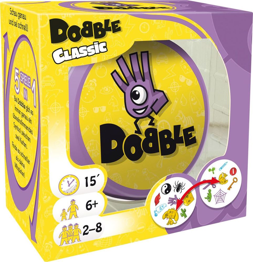 Dobble Classic ist ein Beobachtungs- und Reaktionsspiel, in dem alle Spieler gleichzeitig spielen. 55 Karten, jede mit 8 verschiedenen Symbolen, 5 Spielvarianten... und los geht’s! Welches Spiel ihr auch auswählt, ihr müsst das einzige Symbol, dass auf jeweils zwei Karten abgebildet ist, schneller als eure Mitspieler finden und benennen. Dann nehmt ihr die Karte, die das gleiche Symbol wie eure hat, an euch, legt eure Karte ab oder gebt sie an einen anderen Spieler weiter, je nachdem welche Variante ihr gerade spielt. Ihr könnt jedes der Mini-Spiele nacheinander, total durcheinander oder auch nur ein einziges immer wieder spielen. Ziel ist es, soviel Spaß wie möglich zu haben!