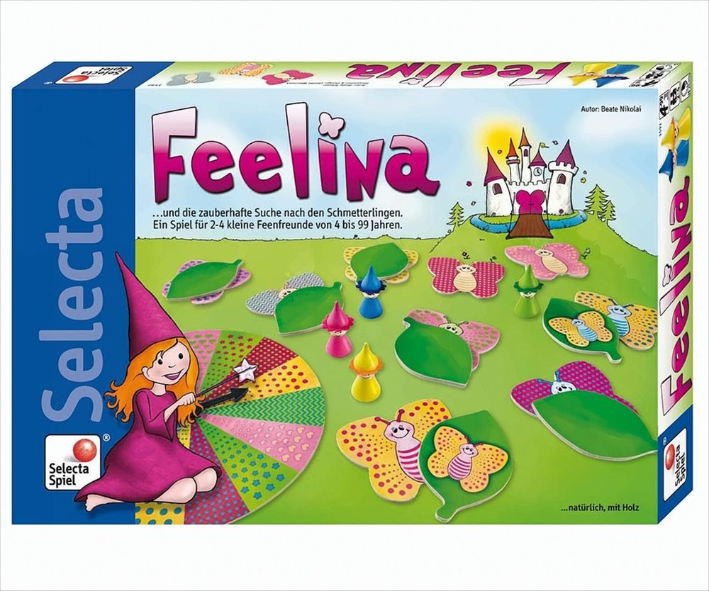Um Schnecken, Schmetterlinge, Feen und eine Vogelscheuche hat Selecta zwei neue Kinderspiele (ab vier Jahren) gestaltet, die einmal mehr den Anspruch des Verlags an gute Spiele deutlich machen: Mit dem zauberhaften Feelina rührt diesmal Selecta bewusst kleinen Feen-Freundinnen ans Herz. Vier zarte Wesen müssen bei diesem neuen Such- und Merkspiel, das sich Beate Nikolai ausgedacht hat, versteckte Schmetterlinge finden. Nur sie kennen den Weg ins Schloss! Schade jedoch, dass sich alle Schmetterlinge unter grünen Blättern verbergen und schlafen. Mit guter Beobachtungsgabe und rascher Reaktion lassen sich die bunt gemusterten Freunde jedoch rasch aufwecken!