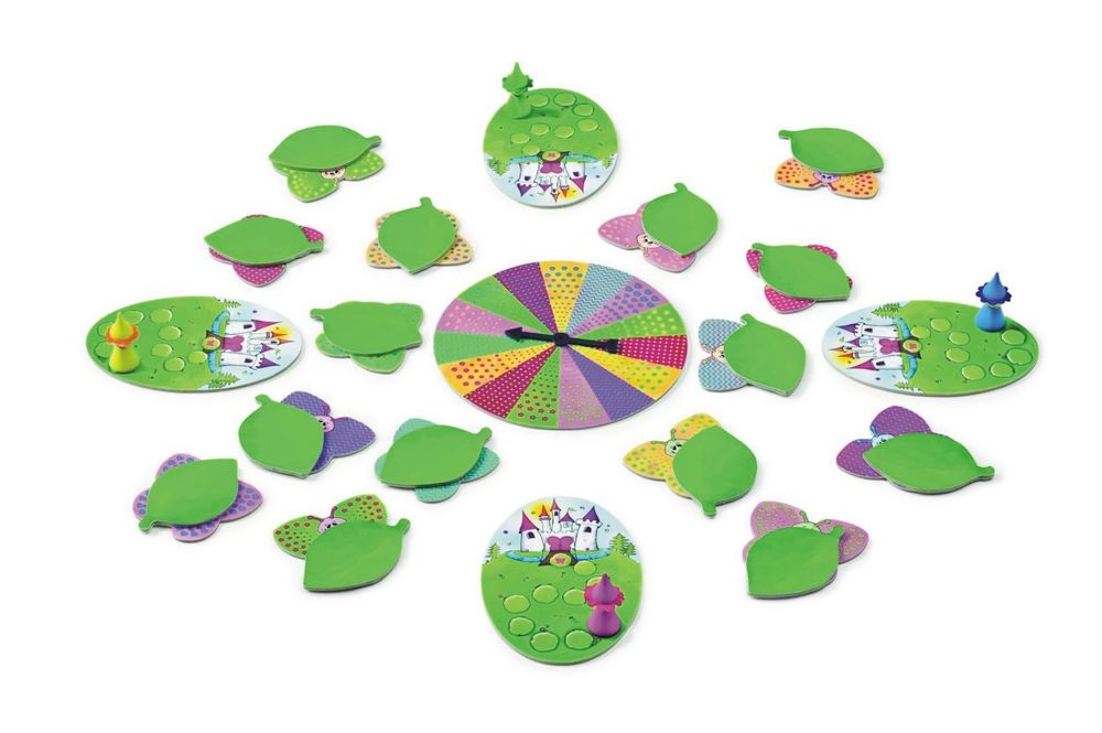 Das Feenreich ist in Aufruhr. Ausgerechnet kurz vor dem jährlichen Feenball hat ein böser Zauberer alle Feen verzaubert. Plötzlich kennen sie den Weg zum Schloss nicht mehr und der Feenball ist in Gefahr. Zum Glück gibt es noch die Schmetterlinge - sie kennen den Weg. Aber die Schmetterlinge haben sich alle unter bunten Blättern versteckt und schlafen. Hilfst Du Feelina und ihren Feenfreundinnen die Schmetterlinge zu finden? Ein Tipp: Jeder Schmetterling hat sein eigenes buntes Muster! Erkennst Du die Unterschiede? Das Glücksrad sagt Dir welchen Schmetterling Du finden musst. Guckt da nicht ein Stückchen Flügel hervor? Jetzt aber schnell - Du willst doch als erster im Schloss ankommen.Inhalt: 4 Spielfiguren, 15 Schmetterlinge, 15 Blätter, 1 Drehscheibe, 4 Schlosskarten, Spielanleitung