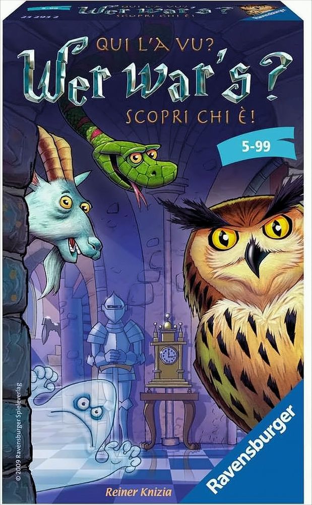 Bei dem Ravensburger Spiel Wer wars? ist die Frage, wer den magischen Ring gestohlen hat. Wenn sich die Spieler die Hinweise der Tiere gut merken, erwischen sie den Dieb noch vor der Geisterstunde. Zuerst wird je nachdem was der Würfel zeigt, eine Aktion ausgeführt. Landet der Spieler mit der Figur auf einem Tierfeld, muss geraten werden, welches Lieblingsfutter sich beim Tier befindet. Stimmt es, darf man den Verdächtigen bei diesem Tier als Dieb ausschließen. Stimmt das Futter nicht, merken es sich alle für später. Die Spieler haben zusammen gewonnen, wenn nur noch eine Person übrigbleibt, bevor der Zeiger die 12 erreicht.