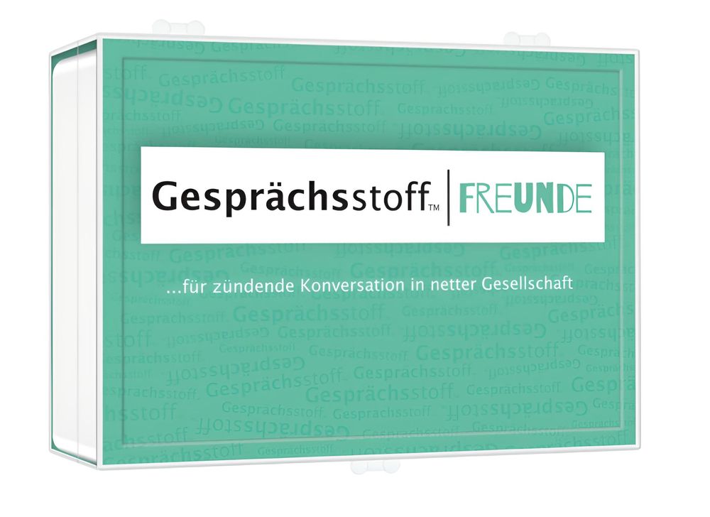 Gesprächsstoff Freunde ...für zündende Konversation in netter Gesellschaft Lerne deine Freunde besser kennen! Gesprächsstoff Freunde beinhaltet mehr als 100 Karten mit unerwarteten, lustigen, verrückten und interessanten Fragen für den ultimativen Abend unter guten Freunden. Sei gefasst auf jede Menge Überraschungen, lustige Anekdoten und verblüffende Erinnerungen! Gesprächsstoff garantiert nicht nur zündende Gespräche bei jedem Dinner, sondern ist gleichzeitig auch eine spannende Möglichkeit auf spaßige Weise gute Freunde besser kennen zu lernen! Eins ist auf jeden Fall garantiert: viel Spaß und leichte Unterhaltung! Ein super Geschenk zu jeder Gelegenheit, von dem alle etwas haben!