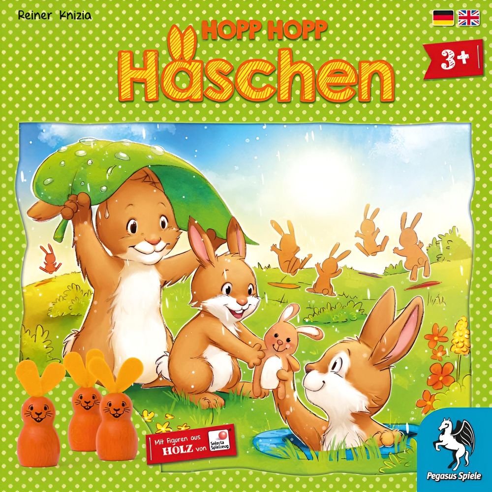 Mit 20 Holzhäschen und einer cleveren Verpackung ist Hopp hopp Häschen ein ebenso brillant ausgestattetes wie kurzweiliges Spielerlebnis für kleine Tierfreunde. Unterstützt wird der Sofort-Losspiel-Faktor des Materials von einer einfachen Regel. Also: An den Würfel, fertig, los!