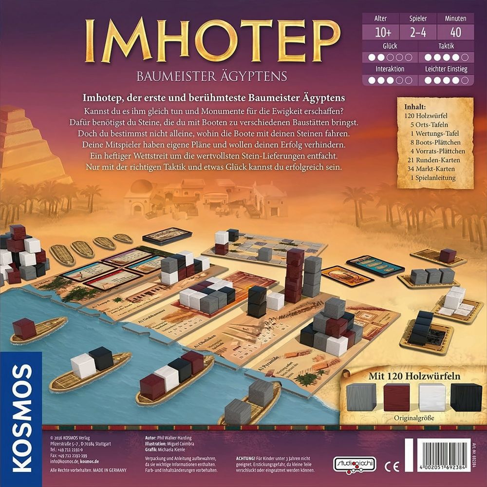 Imhotep war der erste und berühmteste Baumeister Ägyptens. In diesem Strategiespiel werden die Spieler selbst zum Baumeister und erschaffen wie Imhotep Monumente für die Ewigkeit. Dafür werden Steine benötigt, die mit Booten zu verschiedenen Baustätten gebracht werden müssen. Doch die Spieler bestimmen nicht alleine, wohin die Boote mit ihren Steinen fahren. Denn die Mitspieler haben eigene Pläne und wollen den Erfolg der jeweils anderen Baumeister verhindern. Ein heftiger Wettstreit um die wertvollsten Stein-Lieferungen entsteht. Nur mit der richtigen Taktik und etwas Glück können die Spieler erfolgreich sein und Ägyptens beste Baumeister werden.