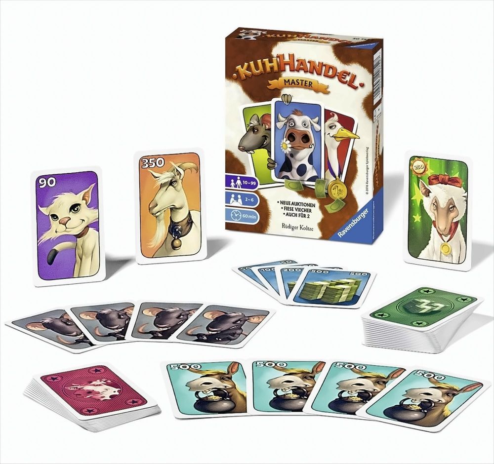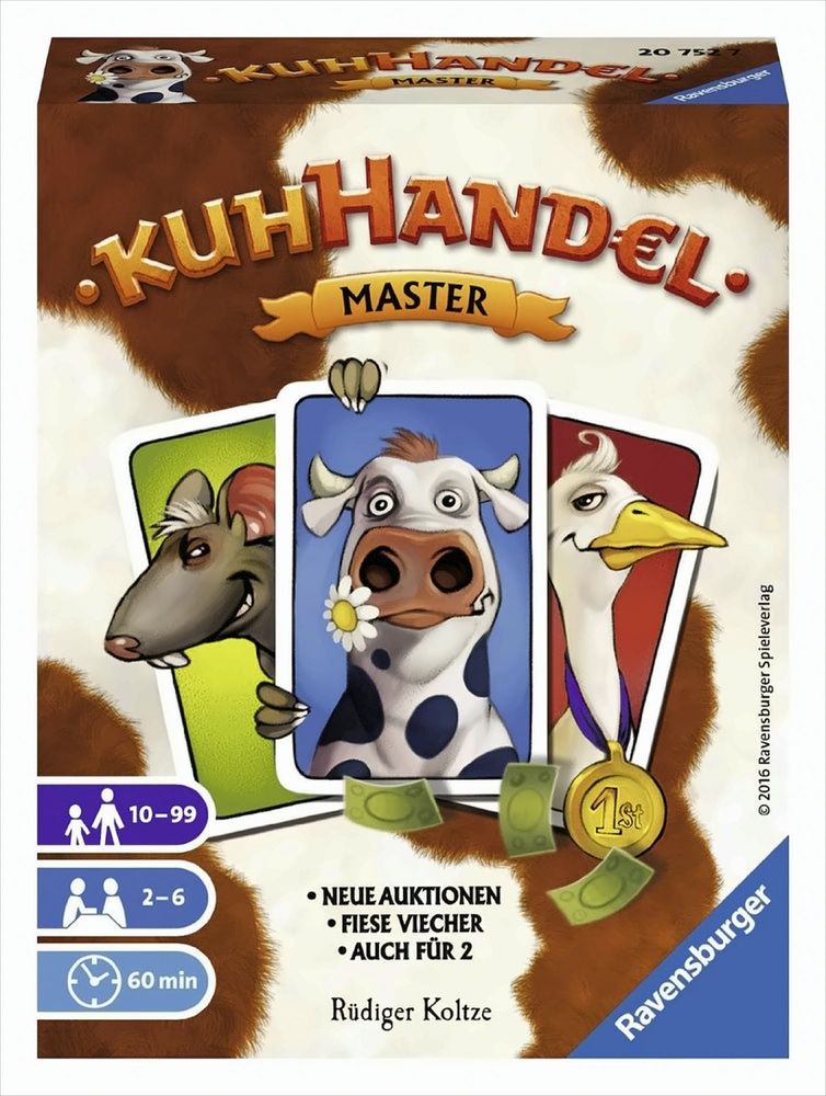 In der Master-Version dreht Kuhhandel richtig auf: mit neuen Tieren, neuen Auktionen und neuen Spielideen! Wie im Klassiker feilscht ihr um Kuh & Co. Aber nun mischen auch fiese Viecher mit! Wenn dich die Ratten packen, gehen ratzfatz die Punkte flöten! Dann doch lieber Superschaf und Luxusschwein schnappen und dafür fette Prämien kassieren. Bis zu sechs Spieler steigern gleichzeitig um die dicksten Viecher. Und im Schnell-Duell könnt ihr Kuhhandel jetzt erstmals auch zu zweit spielen!