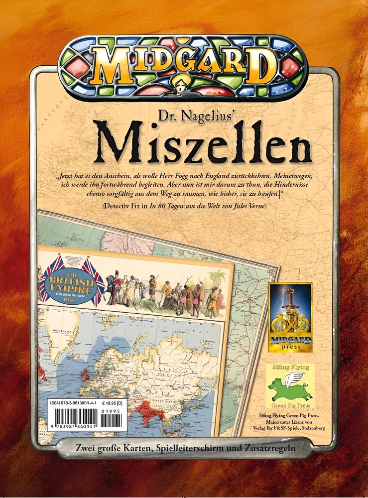 Das Spielleiten von Abenteuer 1880 kann eine schwierige Sache sein: Welche Währung hat man 1885 in Schweden? Und wer genau ist denn da an der Macht? Gibt es eine Direktverbindung mit dem Zug von München nach Budapest? Und wie komme ich am schnellsten mit dem Schiff von einem Ende des British Empire zum anderen? Diesen Fragen nimmt sich ein Teil dieser Miszellen, also dieser bunten Zusammenstellung von Material, an. Zwei großformatige Landkarten (Format 698 x 558 mm) zeigen die Ausdehnung des Empire mit den weltweiten Schiffsverbindungen sowie den Stand des europäischen Eisenbahnnetzes im Jahre 1882. Hinzu kommt ein Sichtschirm für die Spielleiterin mit vier beidseitig bedruckten Seiten im Querformat (280 x 206 mm pro Seite). Die der Spielleiterin zugewandte Seite enthält die zum Leiten einer 1880-Runde notwendigen Informationen, während die Vorderseite die Spieler mit allerlei Nützlichem versorgt: Preislisten, Währungen, Namen und Titel der Herrschenden.