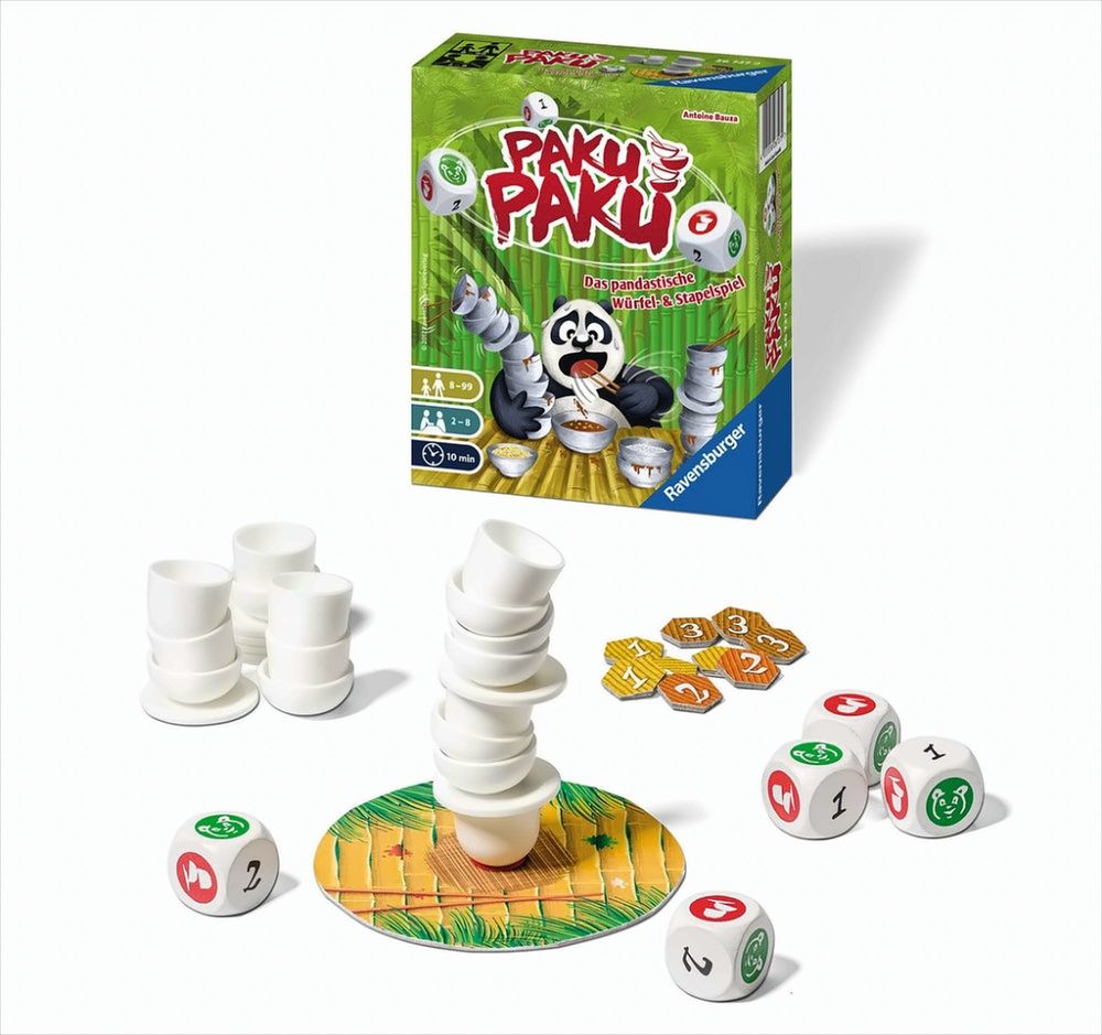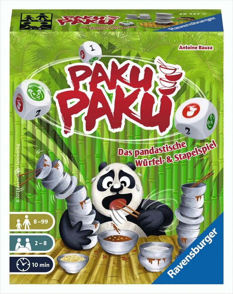 Wer türmt Tassen und Teller in wacklige Höhen? Wer kommt ins Schwitzen, wenn ihm seine Mitspieler flink die Würfel zuschieben? Und wer behält die ruhigsten Tatzen in dem rasanten Würfelspaß für 2 - 8 siegeshungrige Pandas? Diese Packung ist randvoll mit tollem 3D-Spielmaterial und pandastischem Spielspaß. PAKU PAKU Das Würfelspiel für Tellerakrobaten!