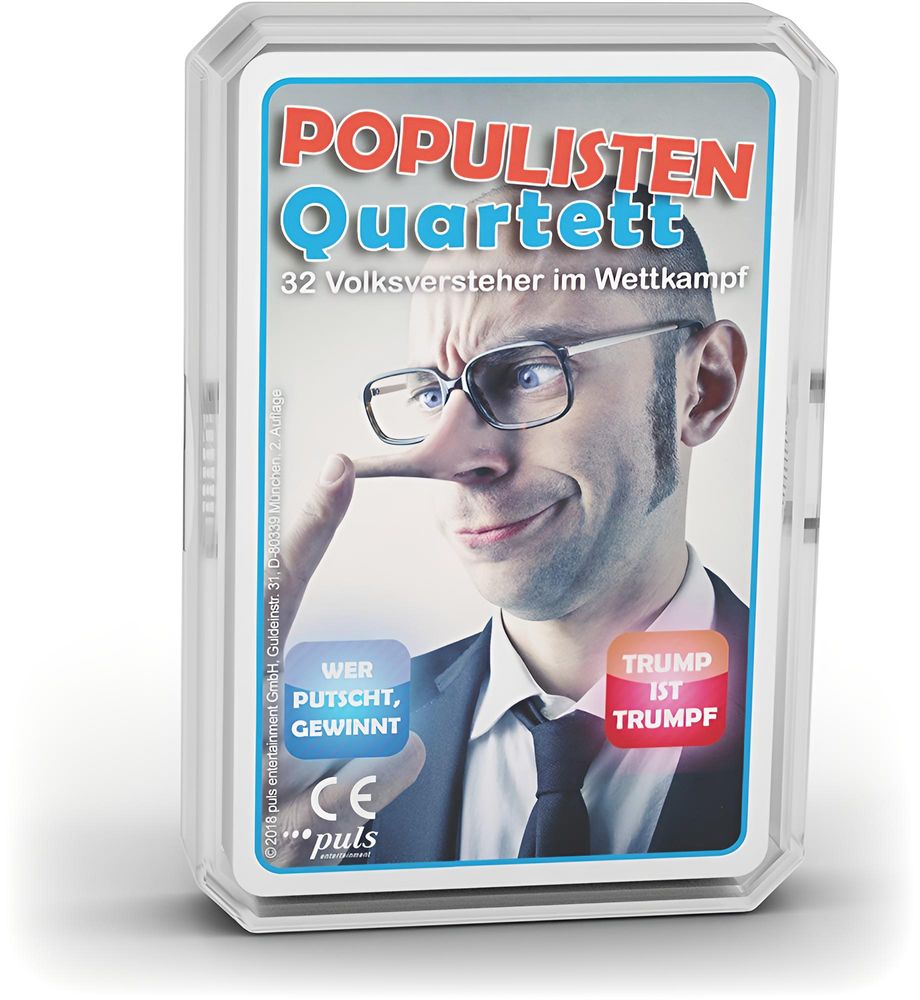 Beim POPULISTEN QUARTETT steigen die 32 Top-Volksversteher unter den Politikern erstmals gegeneinander in den Ring. Ein launiges Kartenspiel für 2-4 Spieler, das mit innovativen Regeln überrascht: Denn im Unterschied zum herkömmlichen Trumpf-Quartett gibt es hier die Möglichkeit, per PUTSCH eine Partie zu gewinnen - oder zu verlieren...