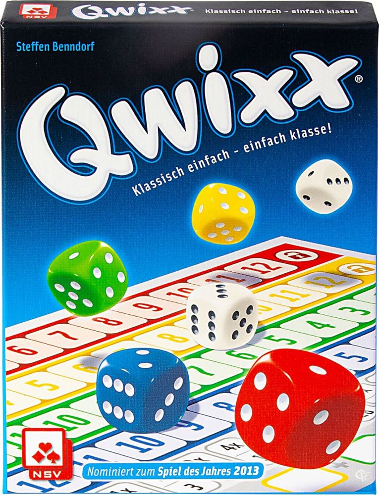 QWIXX ist ein taktisches Würfelspiel mit Kniff. Es gilt so viele Punkte als möglich zu notieren und den Gegner durch schließen von Farbreihen zu benachteiligen. Die eigene Gier und das streben nach der Spielführerschaft machen einen dabei immer wieder einen Strich durch die Rechnung. Viele Wege führen ans Ziel. Welcher Spieler hat die bessere Taktik und den nötigen Überblick? Ein leichter und unterhaltsamer Würfelspaß für die ganze Familie.
