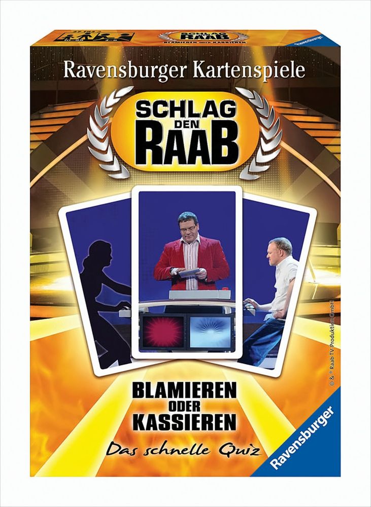 Schlag den Raab: Blamieren oder KassierenDas beliebte TV-Quiz nun auch für zu Hause!Zwei Köpfe - zwei Hände - ein Buzzer!Im spannenden Wissensduell treten die Spieler des Teams einzeln gegen den selbsternannten "Stefan" an. In drei Runden mit je 10 Fragen gilt es, Kasse zu machen. Wer viel weiß und schneller auf den Buzzer schlägt, sammelt viele Euros ein. Doch Vorsicht, wer zu früh zuschlägt, riskiert, auf die falsche Fährte geführt zu werden.