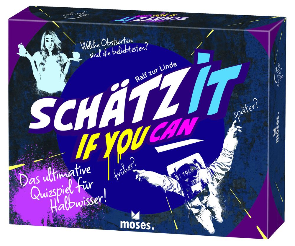 Dieses Spiel vereint außergewöhnliche Quizfragen mit Halbwissen und Bluffen. Denn bei „Schätz it – if you can“ gewinnt nicht, wer am meisten weiß, sondern wer am besten blufft. Spieler*innen, die am Zug sind, decken die Begriffe in der richtigen Reihenfolge auf. Der*die nächste Spieler*in bringt die Begriffe entweder in die richtige Reihenfolge oder segnet die Reihenfolge ab und deckt einen weiteren Begriff auf. Bei Anzweiflung werden die Antworten direkt kontrolliert.