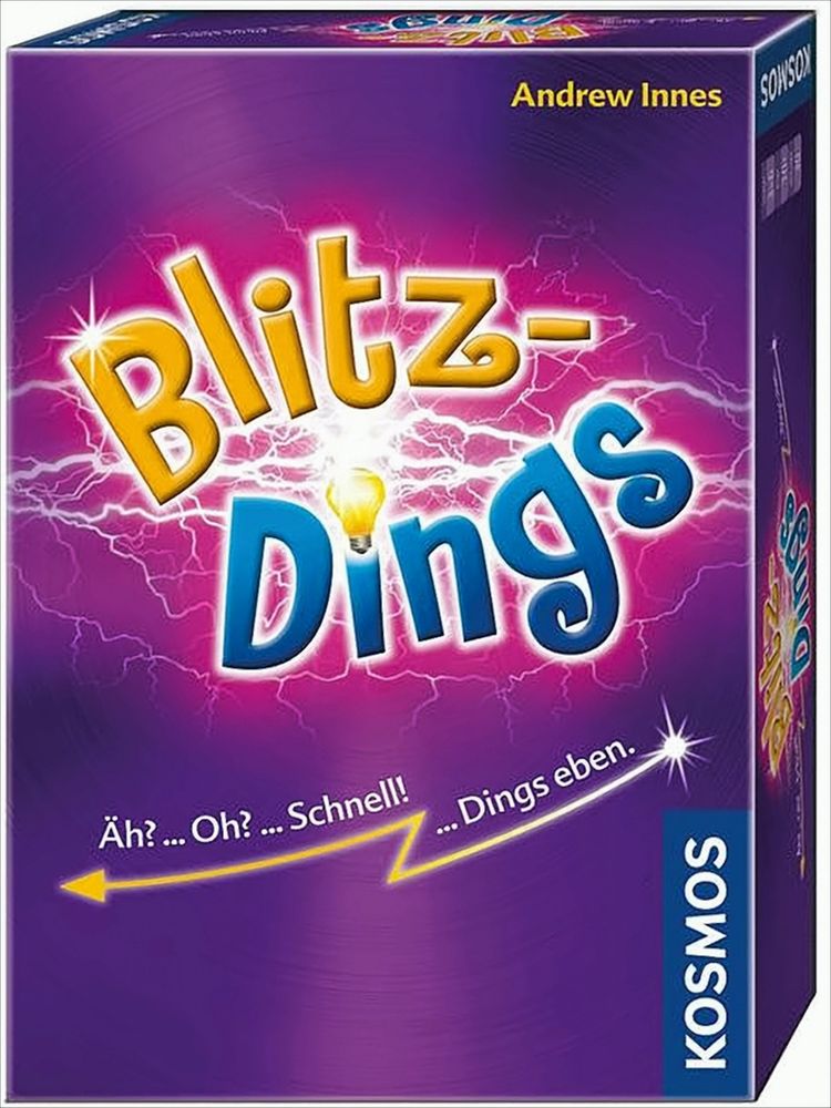 Bei diesem flotten Party-Spiel sind Knoten in Hirn und Zunge garantiert! Nacheinander werden Karten aufgedeckt, auf denen eines von acht Symbolen abgebildet und ein Begriff genannt ist. Sobald zwei Spieler eine Karte mit demselben Symbol vor sich liegen haben, geht es darum, als Erster ein Wort zum Begriff der Mitspielerkarte zu sagen, zu schreien oder wenn es nicht anders geht zu blitzdingsen. Der eine nennt eine Sportart, z. B. Fußball, der andere ein Fahrzeug, z. B. Zug. Wer am schnellsten antwortet, erhält die Karte des Mitspielers. Die Karten ändern sich ständig, so dass schnelles kombinieren und reagieren notwendig ist.