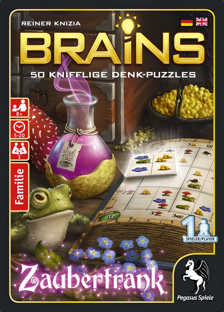 Der vierte Teil der Brains-Reihe bewahrt sich den Charme seiner Vorgänger, benutzt aber eine ganz neue Formel dazu. In 50 Rätseln mit ansteigender Schwierigkeit fordert Brains: Zaubertrank die Spieler dazu heraus, die einzig richtige Lösung für ein Zaubertrank-Rezept zu finden. Um immer schwierigere Tränke zu brauen, müssen die Spieler herausfinden, welche Zutatenplättchen für das jeweilige Rätsel verwendet werden müssen und wie sie zu platzieren sind, um alle Bedingungen zu erfüllen. Diese Bedingungen beziehen sich auf die Reihen und Spalten der Rätsel und verlangen ganz bestimmte Zutaten oder eine spezifische Gesamtmenge von Zutaten oder eine Mischung bestimmter Zutaten ohne Rücksicht auf ihre Menge. Klingt einfach? Rate nochmal! Wie er es bereits mit den vorherigen Brains-Spielen bewiesen hat, sind eine Handvoll Plättchen und einfache Regeln alles, was der vielfach ausgezeichnete Autor Dr. Reiner Knizia benötigt, um herausfordernde Denkaufgaben zu kreieren. Zaubertrank behält die Stärken der Reihe bei und führt gleichzeitig komplett neue Mechanismen ein, die mit einem beliebten Thema kombiniert werden. Inhalt: 25 doppelseitige Puzzel-Tafeln 7 Zutatenplättchen 2 Anleitungen (DE/EN) Lösung