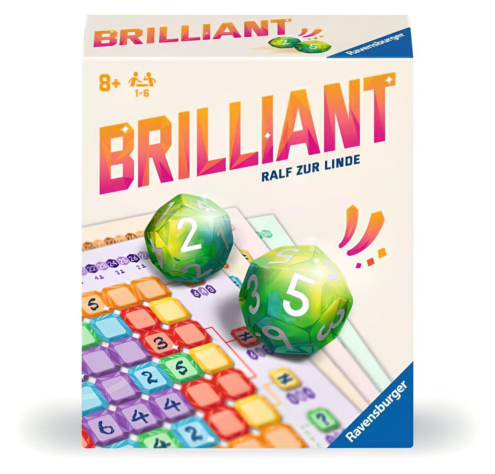 Schnappt euch die Brillanten! Und zwar möglichst vor den anderen! Alle spielen gleichzeitig und es ist brillant einfach und einfach brillant! „Brilliant“ ist ein Roll & Write Spiel mit einem ganz besonderen Clou: Von zwei gewürfelten Zahlen muss eine der beiden neben die andere (bereits eingetragene Zahl) eingetragen werden. Das ist schnell verstanden und schnell gespielt, da alle gleichzeitig spielen. Aber es wird Runde um Runde immer kniffliger, da es immer voller auf euren Blockblättern wird! Wer zuerst die besten Felder vervollständigt, gewinnt das Spiel.