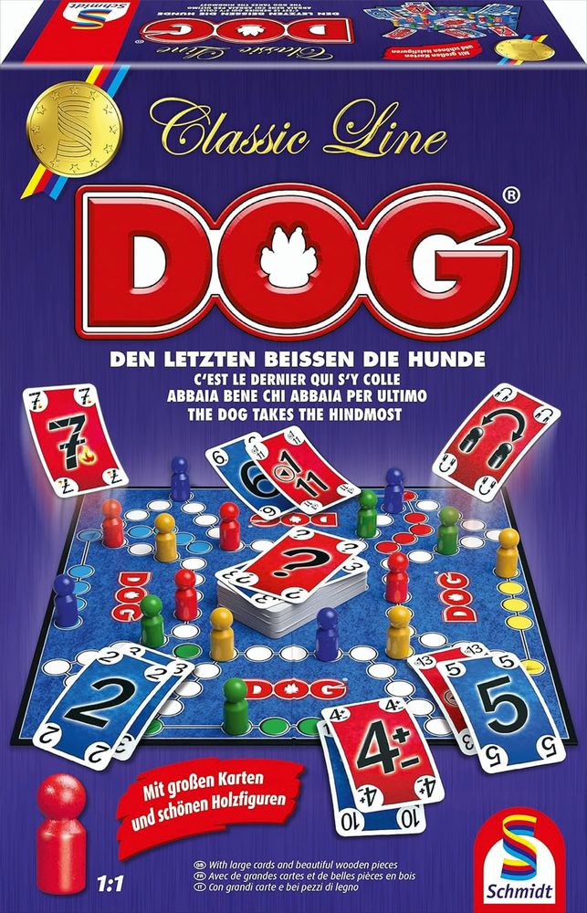 Sie sich von diesem genialen Spiel mitreißen! Vorsicht, wenn Sie einmal angefangen haben, DOG® zu spielen, werden Sie nichts anderes mehr spielen wollen! Sieht aus wie Mensch ärgere Dich nicht, ist aber DOG®! Jedoch bringt man hier seine schönen Holzfiguren mit den Classic-Line großen Karten ins Ziel. Das sorgt für manche Überraschungen … Da gilt es, mit seinem Teamkollegen die richtige Karte zu tauschen und dessen Strategie möglichst vorauszuahnen. Denn den Sieg schafft man nur im Team. Aber gemeinsam gewinnen macht ja auch doppelt Spaß!