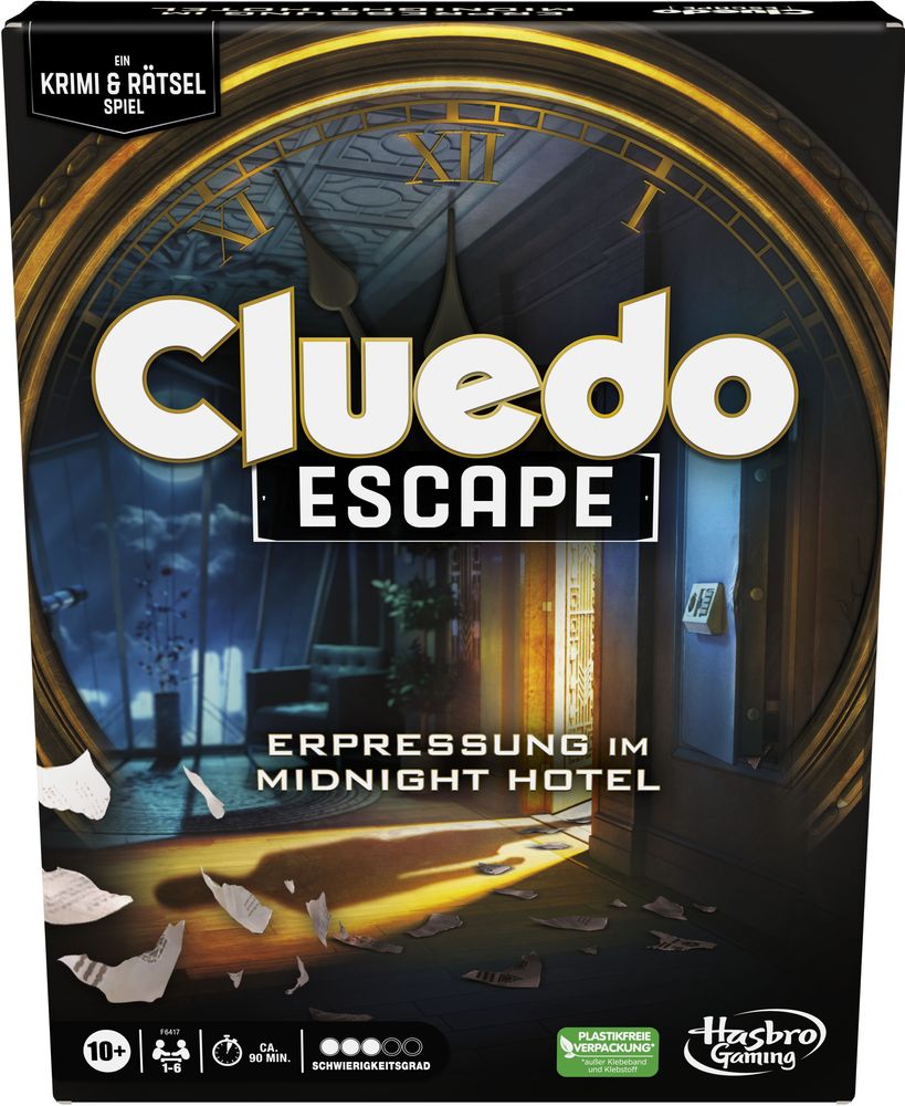 Nach der Ermordung von Dr. Schwarz in der Villa Neubrunn werden alle Gäste, die in der Mordnacht anwesend waren, zu seiner Gedenkfeier im Midnight Hotel eingeladen. Dort erfahren Sie, dass die Erpressungsdateien, die er über alle gesammelt hat, noch existieren ? und jemand hat versucht, sie zu stehlen! Nun gilt es, herauszufinden, WER versucht hat, sie zu stehlen, WO sie gespeichert sind und WIE das Passwort lautet, um sie zu öffnen. Cluedo Escape: Erpressing im Midnight Hotel präsentiert die klassischen Cluedo Charaktere in einem spannenden Escape-Room-Erlebnis. Sie ziehen mit Ihren Figuren über ein dreidimensionales Spielbrett, während Sie Karten ziehen, Rätsel lösen, neue Räume enthüllen und Beweise sicherstellen. Nachdem Sie aus dem Hotel geflohen sind, überprüfen Sie alle Beweise, um die richtige Anklage zu erheben. Hier können Freunde und Familie ein einmaliges Spielerlebnis genießen. Es ist auch ein prima Geschenk für Fans des originalen Cluedo Spiels. Für 1 bis 6 Spieler ab 10 Jahren.