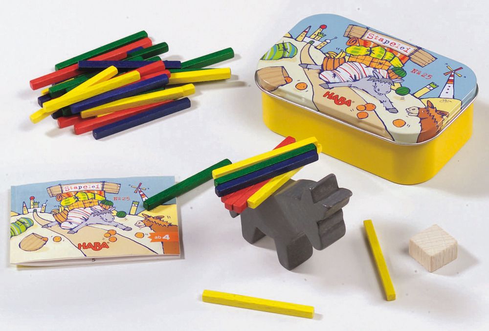 Spielinhalt: 1 Esel, 40 Stäbchen (in vier verschiedenen Farben), 1 Zuckerstück, 1 Spielanleitung.