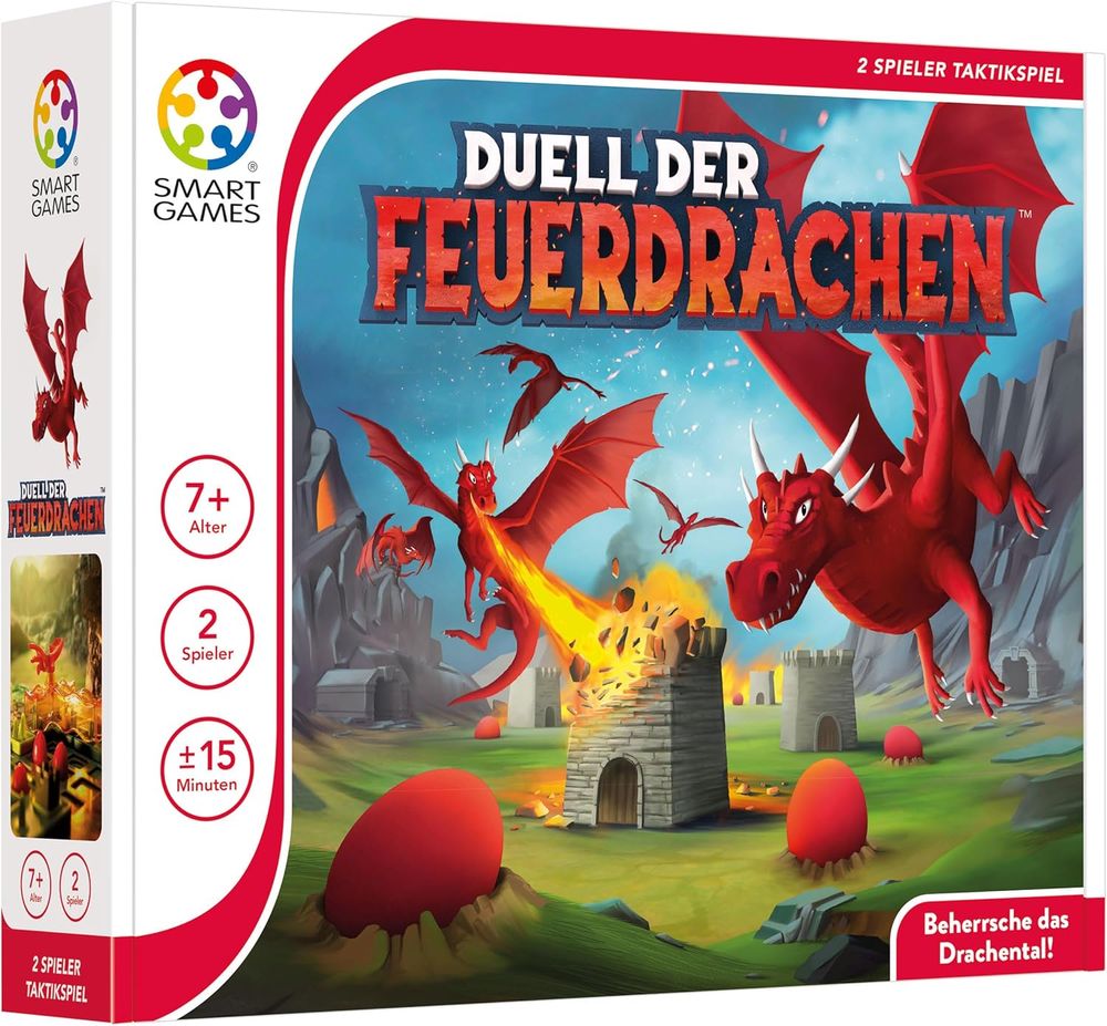 Duell der Feuerdrachen ist ein spannendes Brettspiel, in dem sich zwei Drachenclans in einem taktischen Schlagabtausch gegenüberstehen. Runde für Runde planen die Spielenden ihre Züge, manövrieren ihre Drachen über das Spielfeld und versuchen, mit klug eingesetzten Fähigkeiten die Kontrolle über wichtige Feuerquellen zu gewinnen. Zufallselemente sorgen für Abwechslung, ohne die Bedeutung guter Planung zu schmälern.