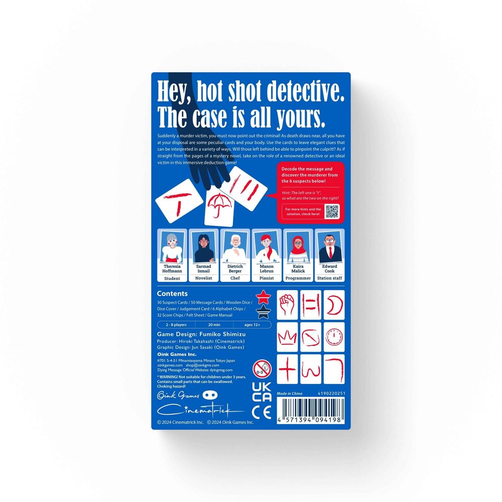 Plötzlich bist du selbst das Mordopfer und musst nun den Täter entlarven! Während der Tod näher rückt, stehen dir nur ein paar seltsame Karten und dein Körper zur Verfügung. Nutze die Karten, um elegante Hinweise zu hinterlassen, die auf vielfältige Weise interpretiert werden können. Werden die Hinterbliebenen den Täter ausfindig machen können!?