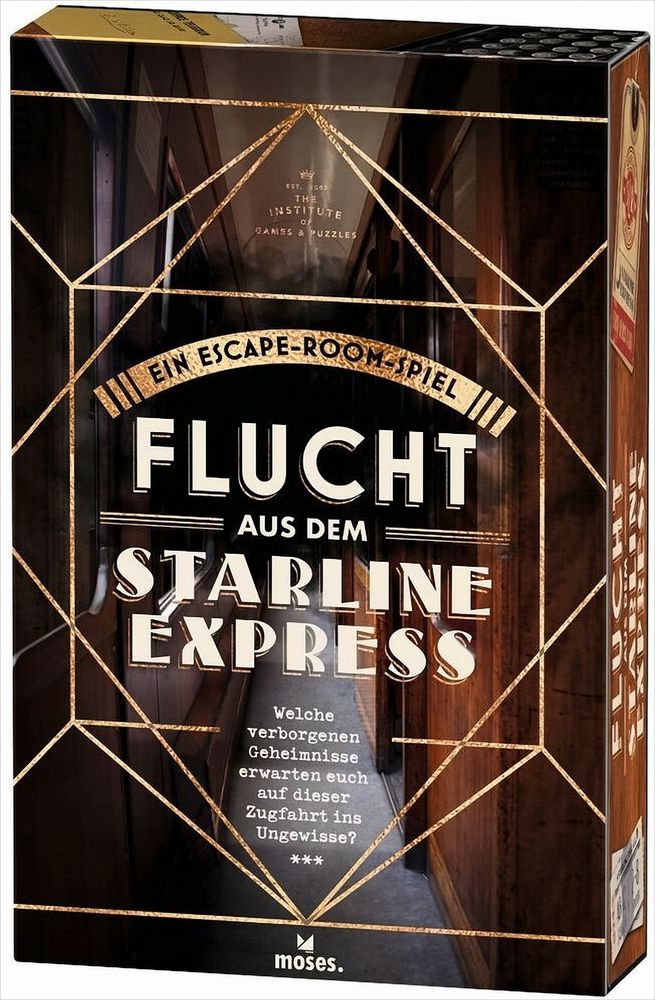 Alles einsteigen, bitte! Begeben Sie sich auf eine geheimnisvolle Reise mit dem Starline Express. Eigentlich wollte die investigative Kriminalreporterin Betty Wilson einfach nur in den Urlaub fahren – und zwar mit dem Starline Express. Doch kurz vor der Abfahrt erreicht sie ein Telegramm, das alles verändert. Die weltberühmte Diamanthalskette Black Widow wurde gestohlen und die einzigen Verdächtigen sind die sechs Mitglieder einer Bande Kleinkrimineller, die ausgerechnet mit Betty Wilson im selben Waggon sitzen. Nun gilt es Beweise zu sammeln, mit denen die Bande hinter Gitter gebracht werden kann. Begeben Sie sich auf eine spannende Reise voller Nervenkitzel und Spaß, in der Sie sich zusammen mit der Reporterin einen Weg durch die verschiedenen Zugwaggons bahnen. Aber Vorsicht: Die Bande ist Ihnen dabei immer dicht auf den Fersen und so beginnt ein Wettlauf gegen die Zeit, der sich nur um eine Frage dreht: Schaffen die Spieler es, den Fall zu lösen, noch bevor der Zug Paris erreicht? Dieses Escape-Game bietet Spannung und kniffligen Rätselspaß bis zur letzten Minute. Eine stimmungsvolle Geschichte und spannende Rätsel führen die Spieler von Waggon zu Waggon. Dort warten einfache bis schwierige Aufgaben auf sie, die im Team mithilfe des detailreich gestalteten Spielmaterials gelöst werden müssen. Anders als bei anderen Escape-Games bleibt das Spielmaterial hier unversehrt und garantiert so grenzenlosen Spiel- und Rätselspaß. Nur wenn alle Rätsel gelöst sind, können die Diebe dingfest gemacht und der Fall zu einem guten Ende gebracht werden.Die Spieler übernehmen gemeinsam die Rolle von Betty Wilson, einer jungen Reporterin.