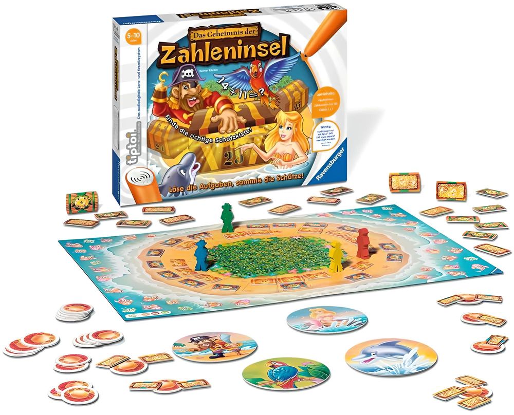 Taucht ein in das Abenteuer auf der Zahleninsel: Am Strand liegen viele Schatzkisten im Sand versteckt. Die Truhen werden bewacht vom schlauen Papagei, der hilfsbereiten Meerjungfrau, dem verspielten Delfin und dem knorrigen Piraten, die euch knifflige Aufgaben stellen. Wer sie löst, darf die Truhen öffnen und die wertvollen Schätze heben. Auf eurem Ausflug begegnen euch ausserdem spannende und lustige Minispiele wie eine Fotosafari, Zahlenfischen oder die Dschungelexpedition. Der tiptoi Stift stellt abwechslungsreiche Aufgaben, die Spass machen und gezielt beim Lernen unterstützen. Spielerisch üben die Schatzsucher Kopfrechnen und das kleine Einmaleins: