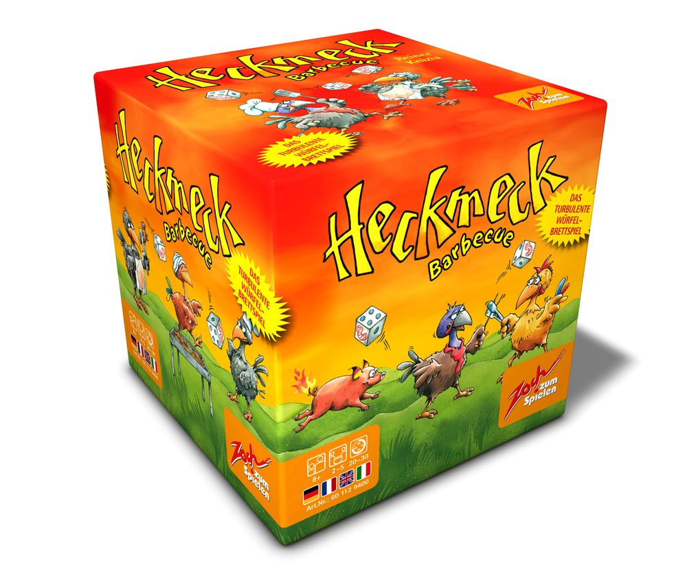 Heckmeck Barbecue ist spannendes Bratwurmwürfeln auf höchstem Spaßniveau. Der Spielplan in der Spielmitte hält 14 unterschiedliche Grillplätze für die Spieler bereit. Um diese begehrten Flächen zu erobern, pickt ein Spieler identische Würfelsymbole aus seinem Wurf heraus und würfelt mit den verbliebenen Würfeln weiter. Erreicht sein Würfelergebnis den Wert einer freien Grillfläche, kann er dort seine Bratwürmer garen und zu sich nehmen.