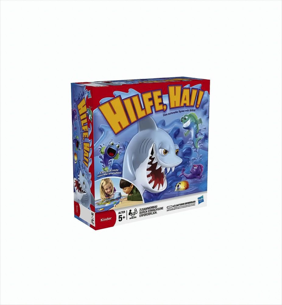 Hilfe, Hai! ist ein schnelles Aktionsspiel mit "Biss" für Kids ab 5 Jahren. Auf dem kreisrunden Spielbrett "schwimmt" ein ca. 25 cm großer, batteriebetriebener Hai und versucht, die verschiedenfarbigen Fischfiguren der Kinder mit seinem zuschnappenden Riesenmaul zu fangen. Sind die Spielfiguren auf dem Brett platziert, geht es auch schon los: Der gefährliche Meeresräuber geht mit seinem Riesenmaul auf Beutezug. Die beiden Farbwürfel geben vor, welche Fische ein Feld weiter schwimmen dürfen. Da heißt es natürlich, schnell würfeln und Reißaus nehmen, um die sichere Bucht zu erreichen, bevor der Fisch zu Haifutter wird. Hilfe, Hai! Ist ein rasanter Spielespaß für bis zu vier Spieler.