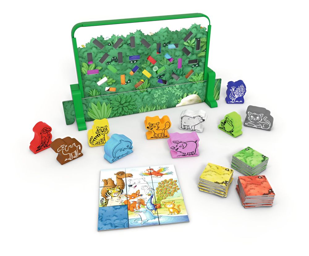 Zehn Tierpaare haben sich in einem großen dreidimensionalen Gebüsch versteckt. Von ihnen sind aber nur einige Farbkleckse durch die Sichtschlitze zwischen den Zweigen zu sehen. Seht genau hin und findet heraus, welche Farben nicht da sind und erkennt so, welche Tiere sich hinter dem Dickicht ganz unten am Busch unsichtbar gemacht haben. In dieses Versteck ziehen sich in jeder Spielrunde neue Tiere zurück. Wer herausgefunden hat, welche Tiere sich gerade im Dickicht verborgen haben, schnappt sich ganz schnell deren Holzfigur! Als Belohnung bekommt jeder der richtig liegt Bildkärtchen, aus denen er seinen eigenen kleinen Zoo zusammenpuzzeln darf.