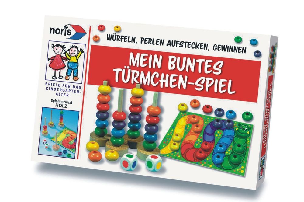 Zwei lustige Farbenspiele!Jedes Kind bekommt ein leeres Türmchen und sechs Holzperlen in den Farben Rot, Blau, Grün, Gelb, Orange und Violett. Ein Wurf mit dem Farbwürfel - und schon ist klar, welche Perle zuerst auf das Türmchen gesteckt werden darf. Wer hat zuerst alle 6 Perlen auf seinem Türmchen?Ein Spiel mit zwei Spielvarianten - gut zum Lernen der Farben.