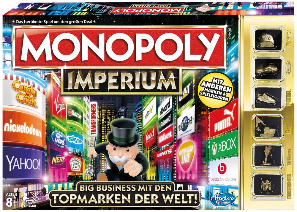 Für eine Partie werden die Spieler zum Chef ihrer Lieblingsmarken und errichten mit dem Kauf internationaler Topmarken ein echtes Imperium. Anstelle von Straßen und Plätzen wird bei dieser Monopoly Variante mit 22 Spitzenunternehmen gehandelt: von Yahoo! über Xbox bis hin zu Puma. Die Spieler kaufen sich in die Unternehmen ein und sammeln Firmenlogos in ihrem Turm damit jeder sehen kann, wie weit sie es schon gebracht haben. Die Karriere vom Tellerwäscher zum Marken-Mogul ist mit Monopoly Imperium in rund 30 Spielminuten möglich, und wer zuerst seinen Imperium-Turm bis oben hin mit Logos gefüllt hat, hat gewonnen.