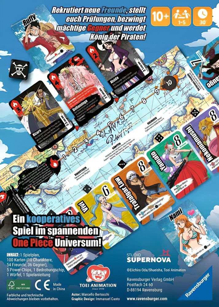 Versammelt eure Freunde und setzt die Segel für ein neues One Piece Abenteuer! In diesem kooperativen Brettspiel rekrutieren 1-5 Spieler gemeinsam neue Freunde, erledigen Missionen und besiegen mächtige Gegner, um Piratenkönige zu werden. Je mehr Gegner besiegt werden, desto mehr Belohnungen erhält man. Belohnungen bestimmen, welche Art von Piraten die Spieler werden. Aber Vorsicht! Unbesiegte Gegner stellen eine Bedrohung dar! Werden zu viele Freunde verloren, ist euer Abenteuer gescheitert!