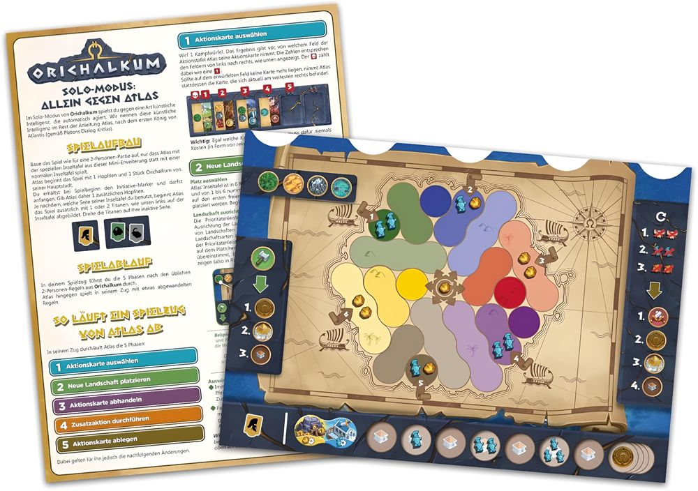 Allein gegen Atlas ist eine Mini-Erweiterung mit einem Solo-Modus für das Kennerspiel Orichalkum. Dadurch kann eine einzelne Person gegen eine Art künstliche Intelligenz spielen, die automatisch agiert. Atlas, der automatisierte Gegner, spielt auf einem eigenen, doppelseitigen Tableau mit etwas abgewandelten Regeln. Wer hat das Zeug dazu, Atlas zu besiegen?