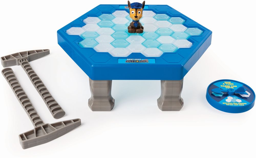 Chase ist auf spannender Mission, Schritt für Schritt tappt er über brüchiges Eis. Hilf ihm, den richtigen Weg zu finden, damit er nicht einbricht. Nacheinander klopft jeder Spieler einen Eisblock heraus. Je öfter geklopft wird, desto schneller fallen die Blöcke. Vorsicht und Geschicklichkeit sind gefragt, denn Chase darf nicht abstürzen. Das beliebte Spielkonzept für 2-4 Spieler ab 5 Jahren.