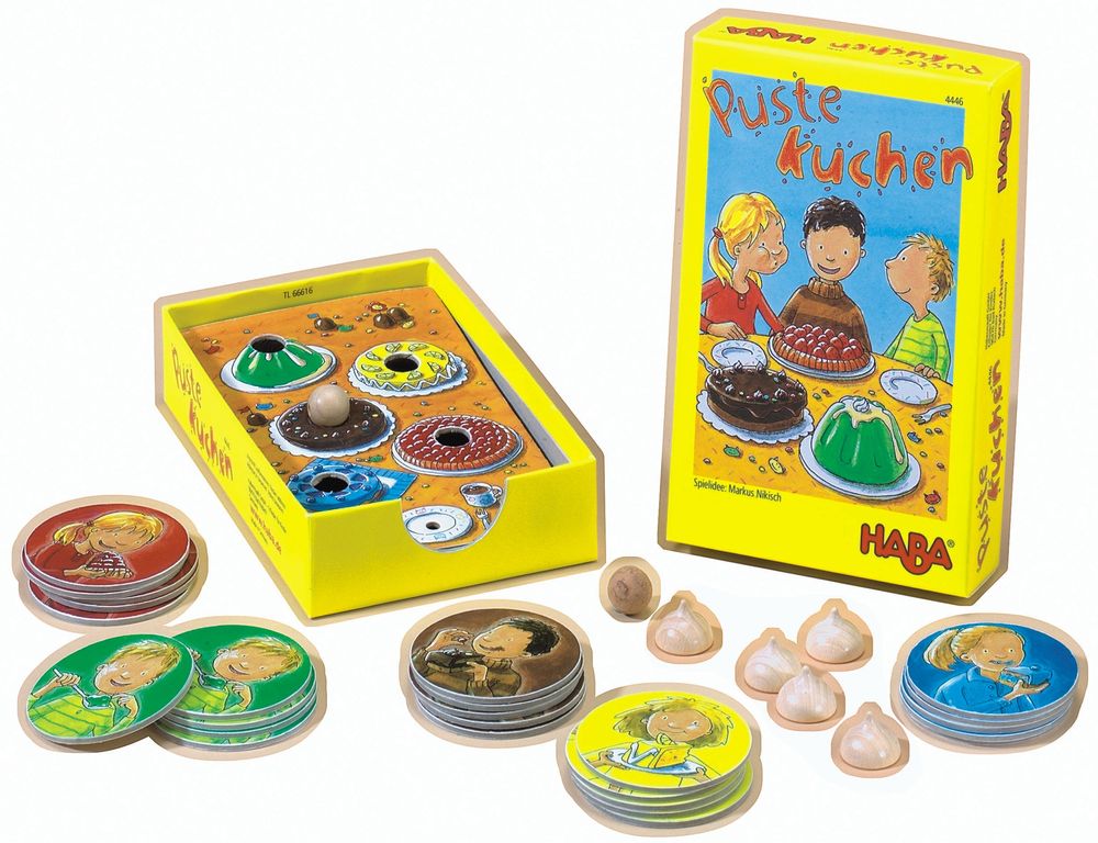 Inhalt: 1 Spielplan: Geburtstagstisch mit Teller, Kuchen, Torten und Pudding, 5 Sahnehäubchen, 1 Korkkugel, 1 Holzkugel, 25 rundeKarten: Geburtstagsgäste, die verschiedene Leckereien essen, 1 Spielanleitung.