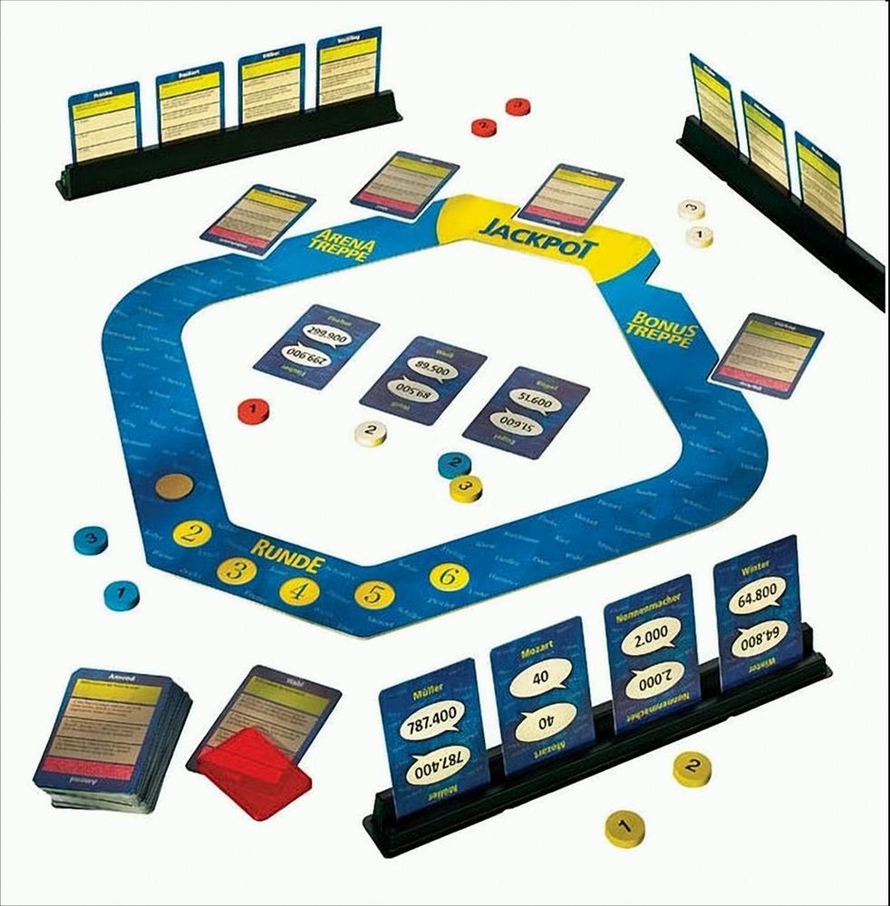 Inhalt: 1 Spielarena, 15 Tippsteine, 165 Namenskarten, 5 Kartenhalter, 1 Decoder, 1 Rundenchip, 1 Spielanleitung
