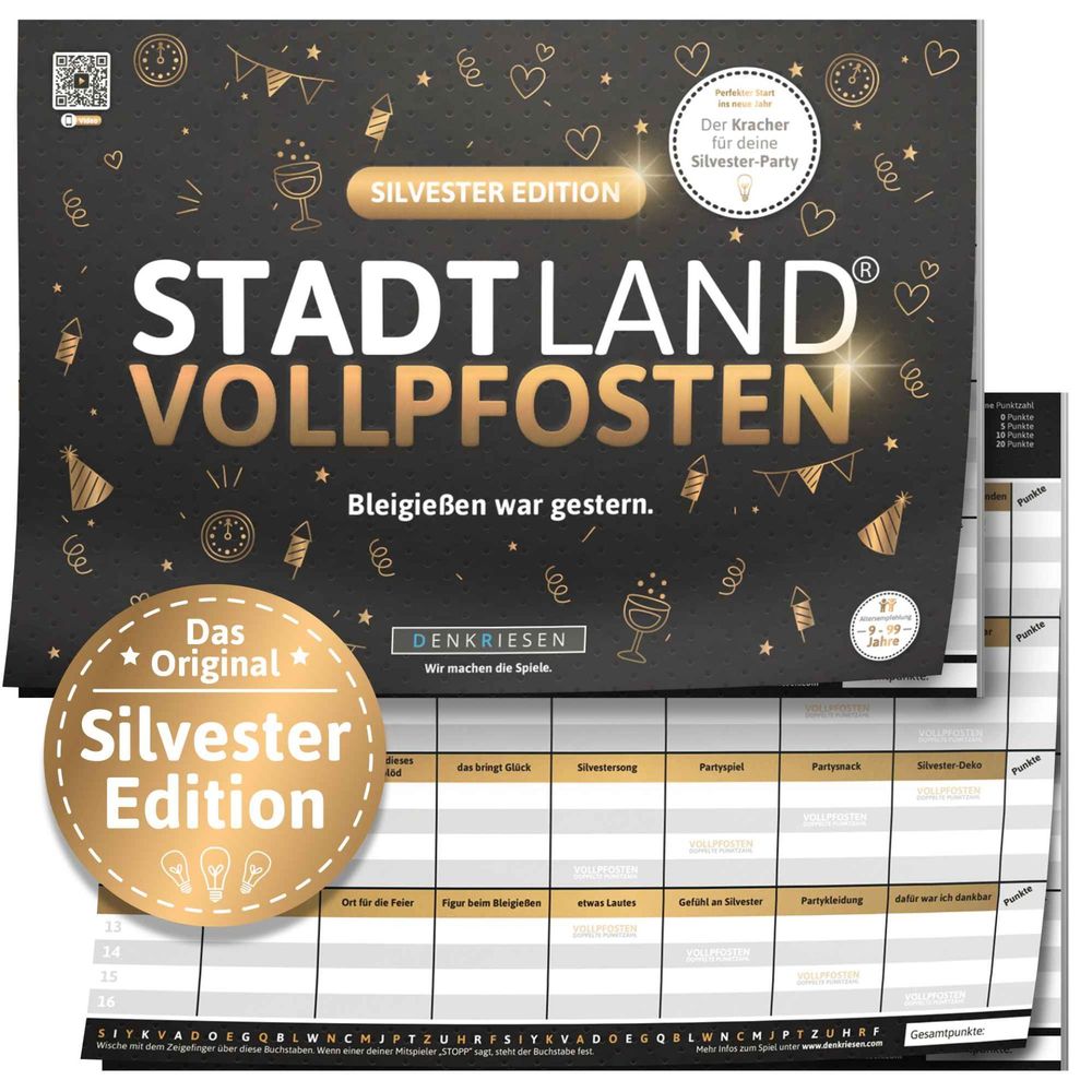 Macht den letzten Tag des Jahres unvergesslich mit der offiziellen Silvester-Edition von STADT LAND VOLLPFOSTEN. Der ultimative Spielblock mit 26 heiteren Kategorien rund um den Jahreswechsel für einen lustigen Silvester-Abend mit Freunden.