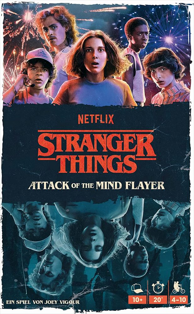Der Mind Flayer kontrolliert andere Menschen und bildet aus ihnen eine Armee, um die Erde zu unterwerfen. Manche von euch sind bereits unter seiner Kontrolle … Bleibt wachsam und passt auf, dass er nicht euch auch noch angreift. Werdet ihr es schaffen, den Mind Flayer und eure besessenen Freunde aufzuhalten? Oder werdet ihr am Ende alle in der Armee dieses Unheils sein? Stranger Things: Attack of the Mind Flayer bringt euch nach Hawkins und lässt euch in die Rollen der Helden der weltweit erfolgreichen Netflix Serie eintauchen. In zwei Teams müsst ihr euch entweder dem Mind Flayer entgegenstellen oder ihm helfen, seinen dunklen Plan in die Tat umzusetzen. Zu Beginn wird zufällig festgelegt, wer bereits besessen ist und somit alle anderen auf seine Seite ziehen möchte, und wer im Team der gesunden Charektere ist. In diesem schnellen Kartenspiel gibt es einfache und klare Regeln. Blufft, gebt hilfreiche Karten an vermeintliche Freunde und fiese Karten an vermutete Freunde weiter. Niemals dürft ihr sagen, auf welcher Seite ihr steht, bevor das Ende kommt. Überlebt ihr bis zum Ende, nachdem drei Begegnungen ausgeführt wurden, stellt sich die große Frage: Schaffen es die Untertanen des Mind Flayers, ihn zu beschwören, oder hat zumindest ein Spieler seinen Verstand und sein Leben behalten, um ihn zu vertreiben?