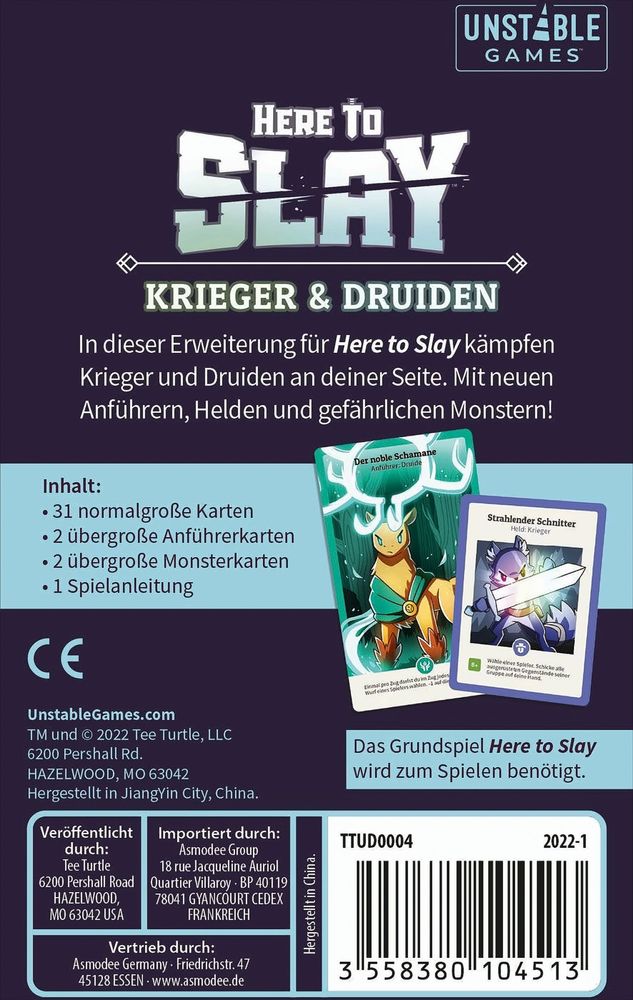 In dieser Erweiterung für Here to Slay kämpfen Tiere aus den beiden neuen Klassen Krieger und Druiden an deiner Seite, damit du dein perfektes Team aus Helden zusammenstellen kannst. Mit neuen Anführern, Helden und noch gefährlicheren Monstern!