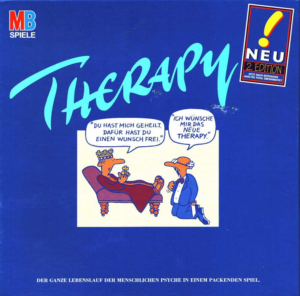 Der ganze Lebenslauf der menschlichen Psyche in einem packenden Spiel.Der Spieler, der am Zug ist würfelt und setzt seine Couch im Uhrzeigersinn um die entsprechende Zahl von Feldern weiter. Auf jedem Feld erhält er Anweisungen, die er zu erfüllen hat. Nach den Therapie-Karten muß man einen Mitspieler kurieren, der in der eigenen Praxis landet, oder man wird therapiert, wenn man selbst in einer fremden Praxis landet. Die Antworten zu den Therapie-Karten werden verdeckt von Patient und Therapeut notiert und anschließend verglichen. Bei Übereinstimmung erhält man einen "Geschafft"-Stift. Auch wer Wissensfragen richtig beantwortet oder einen ”Fintenklecks” richtig interpretiert, erhält einen Stift. Sieger ist wer zuerst 6 Stifte (entsprechend den 6 Lebensabschnitten) auf seiner Couch hat.