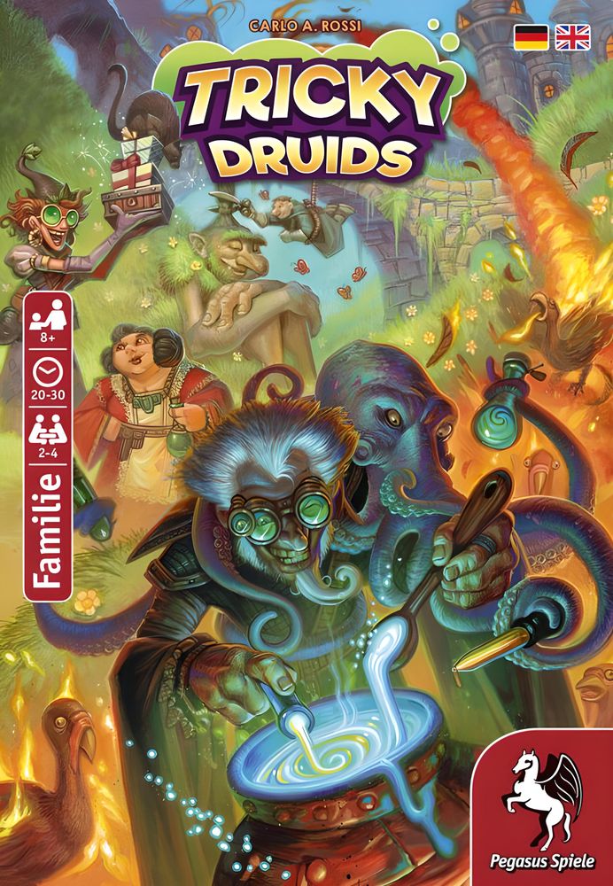 Sie zaubern, sie sammeln und das Beste: sie verschenken alles! Die Druiden aus Tricky Druids verbringen den ganzen Tag damit, Zutaten für ihre Zaubertränke zu sammeln. Doch anstatt diese für sich zu behalten, beschenken sie sich gegenseitig. Das hört sich toll an, oder? In Tricky Druids schlüpfen die Spieler in die Rolle der freundlichen Druiden. Ihre Aufgabe ist es, Zaubertränke zu brauen, die sie in ihren Hütten versteckt halten. Jeder Trank benötigt spezielle Zutaten, die mit den Zutatenwürfeln gesammelt werden können. Weil die Druiden aber so schrecklich nett sind, entscheiden sie dann, welche der Zutaten sie an einen der anderen verschenken möchten. Derjenige kann sich nun entscheiden, das Geschenk dankend anzunehmen oder es höflich zurückzugeben. Weist der Mitspieler das Geschenk zurück, muss der Schenkende die Zutaten in den eigenen Trank mischen - oder in den Abfall werfen. Wenn der mal nur nicht überläuft!