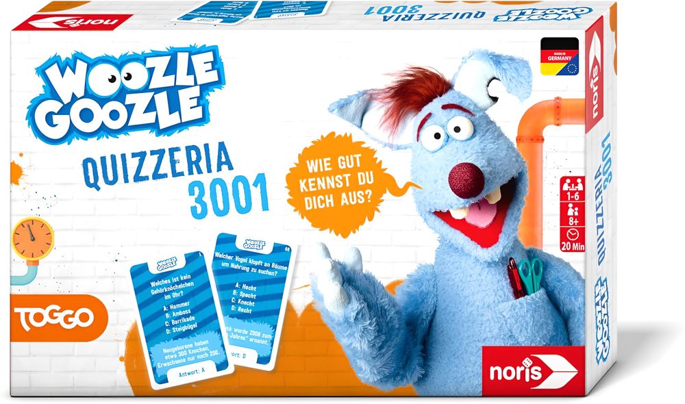 Woozle Goozle Quizzeria 3001 ist ein abwechslungsreiches Brettspiel rund um Wissen, Neugier und verrückte Ideen. Die Spielenden treten in spannenden Fragerunden gegeneinander an, meistern kreative Aufgaben und sammeln Punkte, indem sie ihr Wissen zu unterschiedlichsten Themenbereichen unter Beweis stellen. Dank einfacher Regeln gelingt der Einstieg schnell, sodass die erste Runde schon nach wenigen Minuten starten kann.