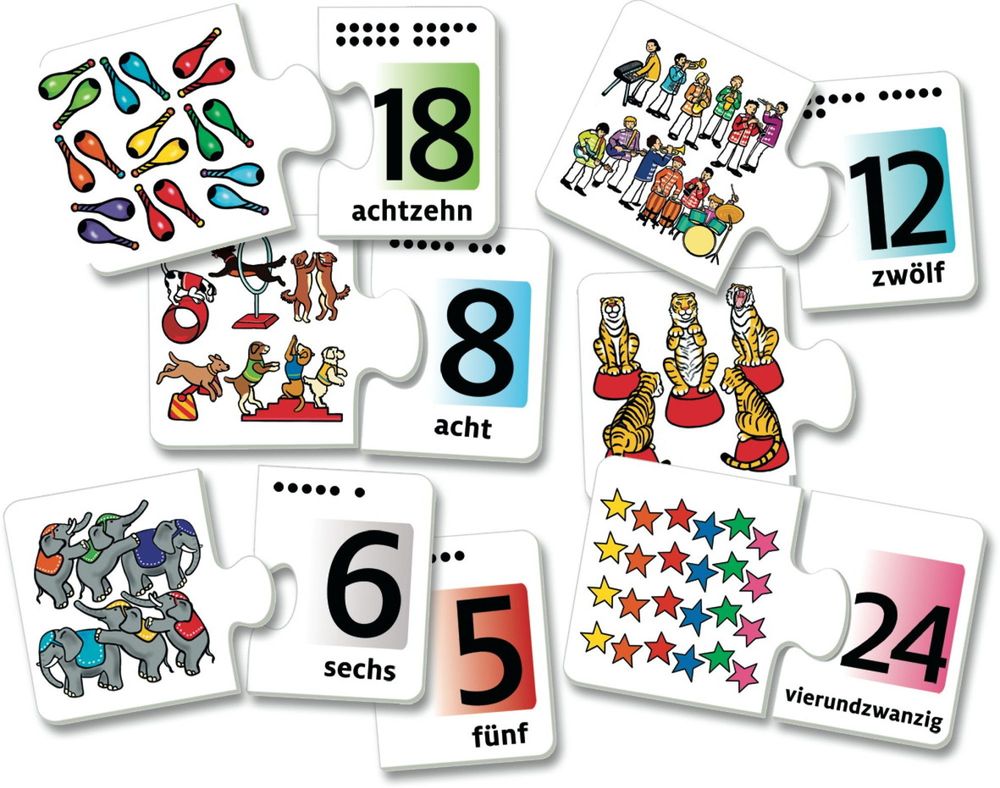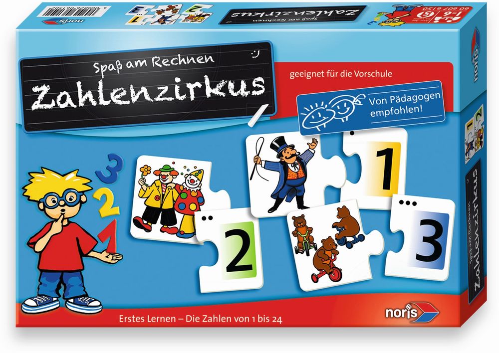 "Zahlenzirkus" ist ein von Pädagogen empfohlenes Lernspiel, das Kindern nicht nur das Lernen der Zahlen von 1 bis 24 ermöglicht, sondern auch ein Gefühl für die konkrete Menge vermittelt. So muss jedem Zahlenkärtchen ein Mengenbild zugeordnet werden. Erleichtert wird die Suche durch den Puzzleschnitt an den Teilen und den bunten Abbildungen.