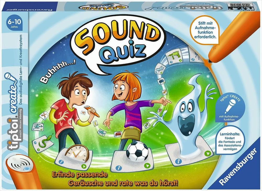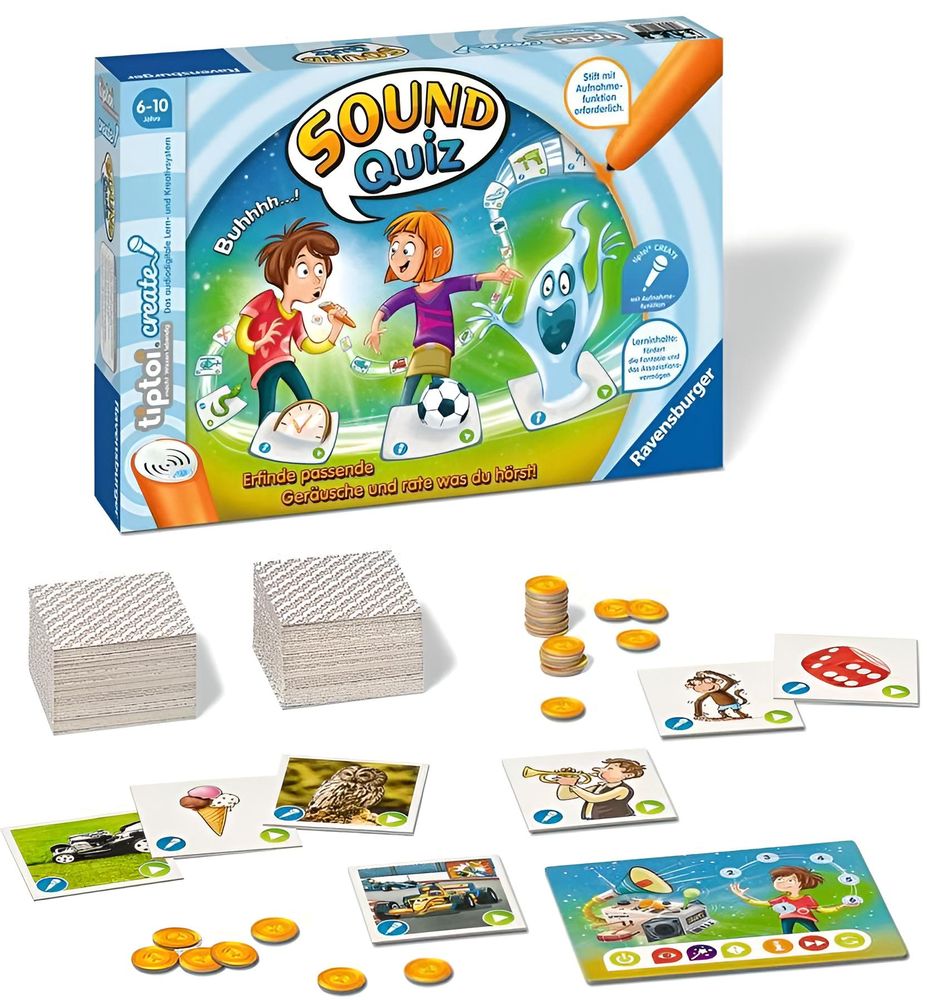 Wie klingt eine Trompete? Welchen Sound macht ein Rennauto? Lässt sich ein Eis mit Geräuschen beschreiben? Im Spiel Sound-Quiz ist Kreativität gefragt. tiptoi CREATE ist die Produktreihe, in der die Aufnahmefunktion des Stiftes eine zentrale Rolle spielt. Der Spieler, der an der Reihe ist, zieht ein geheimes Bildkärtchen. Er erfindet ein Geräusch, das zum Bild passt, und nimmt es mit dem tiptoi Stift auf. Die anderen Spieler hören zu und raten, um welche Karte es sich handelt. Im zweiten Teil spielt tiptoi die Aufnahmen in zufälliger Reihenfolge ab. Nun gilt es, die Geräusche wiederzuerkennen und die passenden Bildkärtchen schnell zu finden. tiptoi CREATE beflügelt die Fantasie – die Spieler denken sich Geräusche aus, ahmen Tiere nach und vertonen Bilder. Dabei darf einfallsreich um die Ecke gedacht werden. Zum Spielen wird ein tiptoi Stift mit Aufnahmefunktion benötigt. Die kostenlose Audiodatei für dieses Spiel lädt man sich einfach, sicher und schnell über den tiptoi Manager auf den Stift.